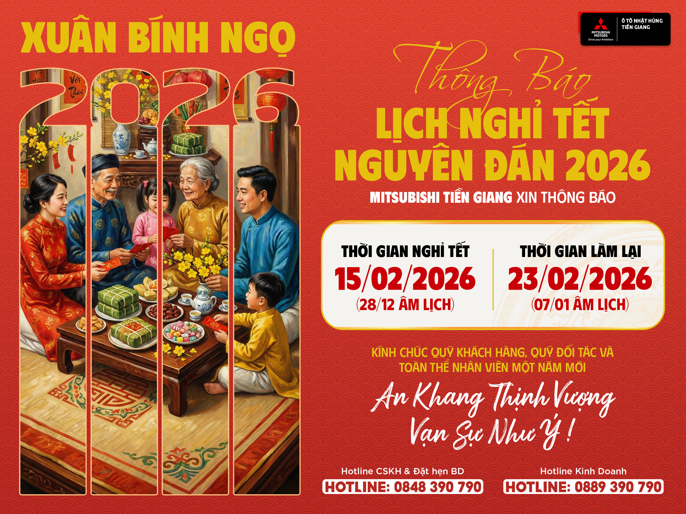Xuân Bính Ngọ 2026 đang gõ cửa, Mitsubishi Tiền Giang trân trọng thông báo đến Quý Khách Hàng & Quý Đối Tác lịch nghỉ Tết như sau: